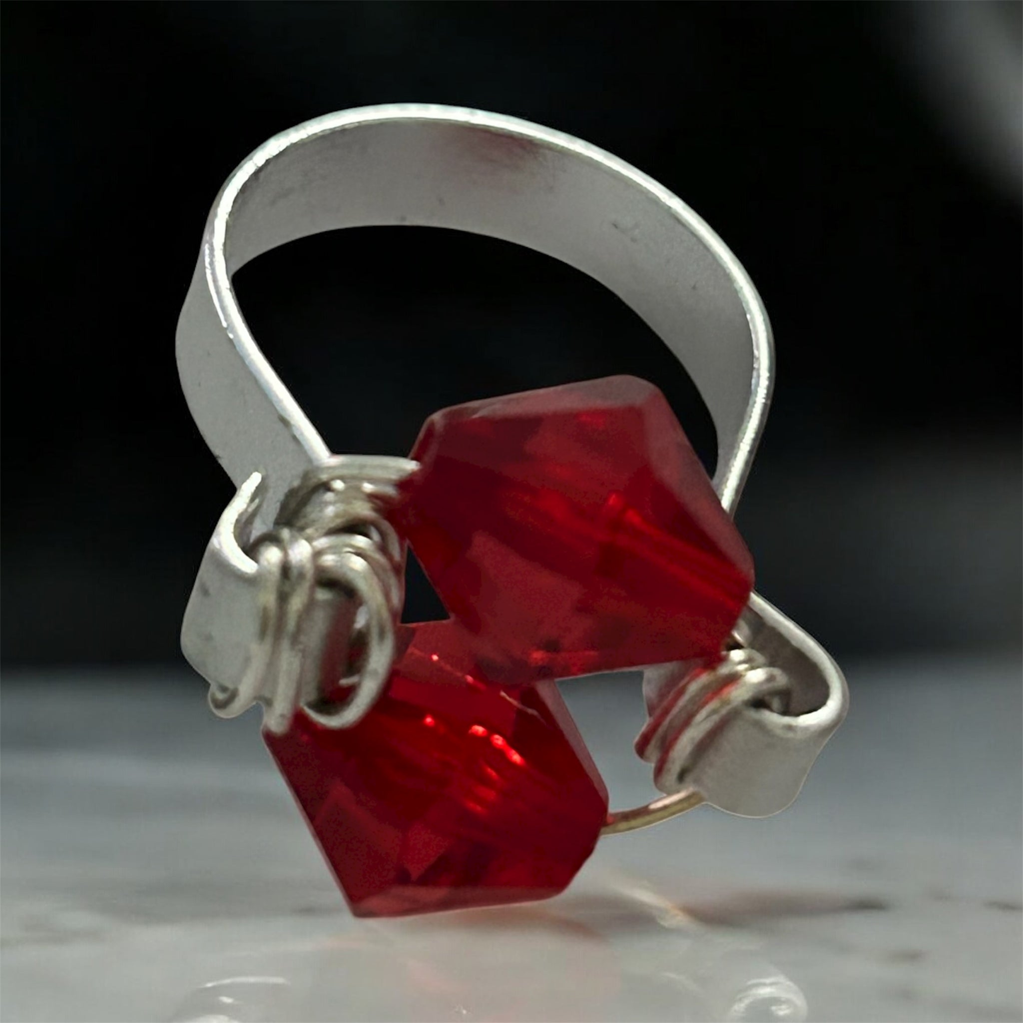Beautiful handcrafted ring made with silver wire and red crystal bead.