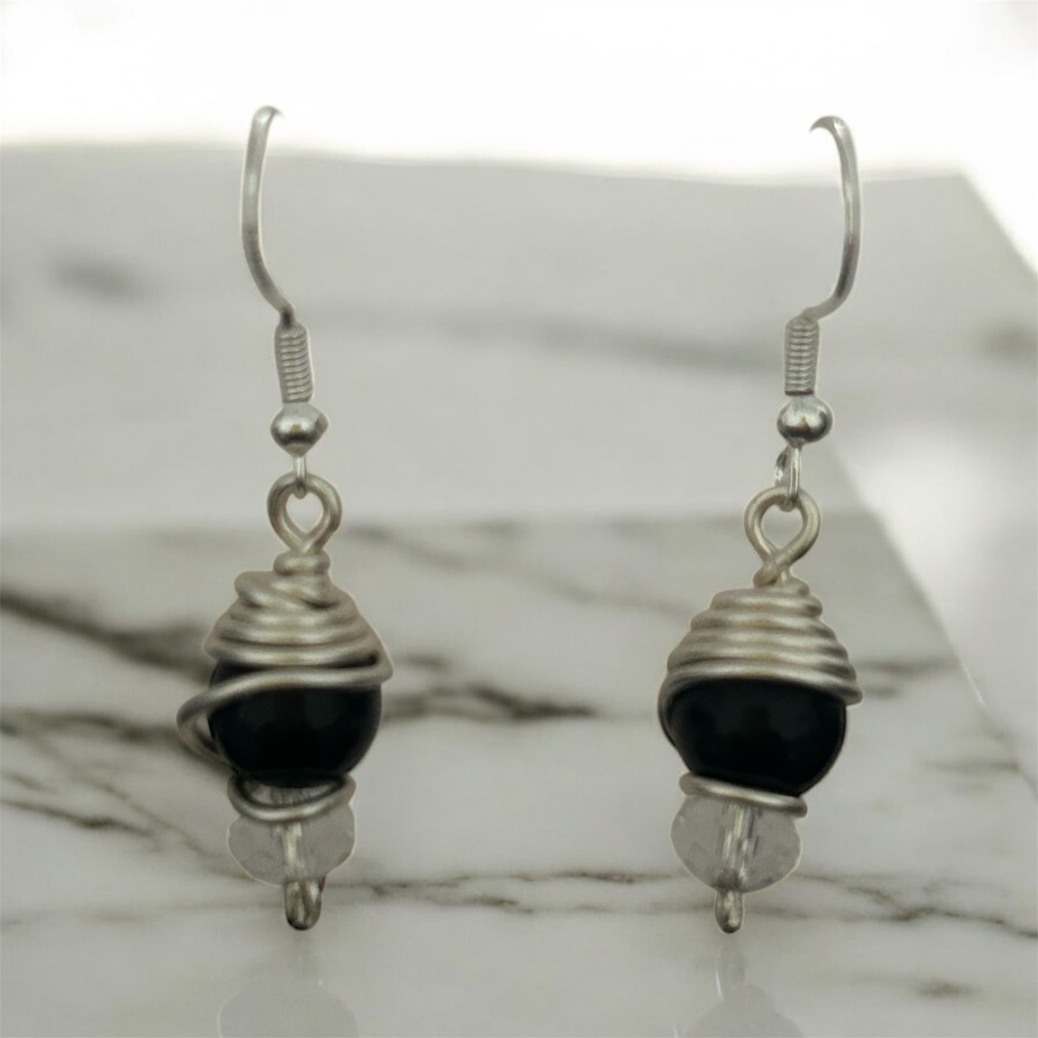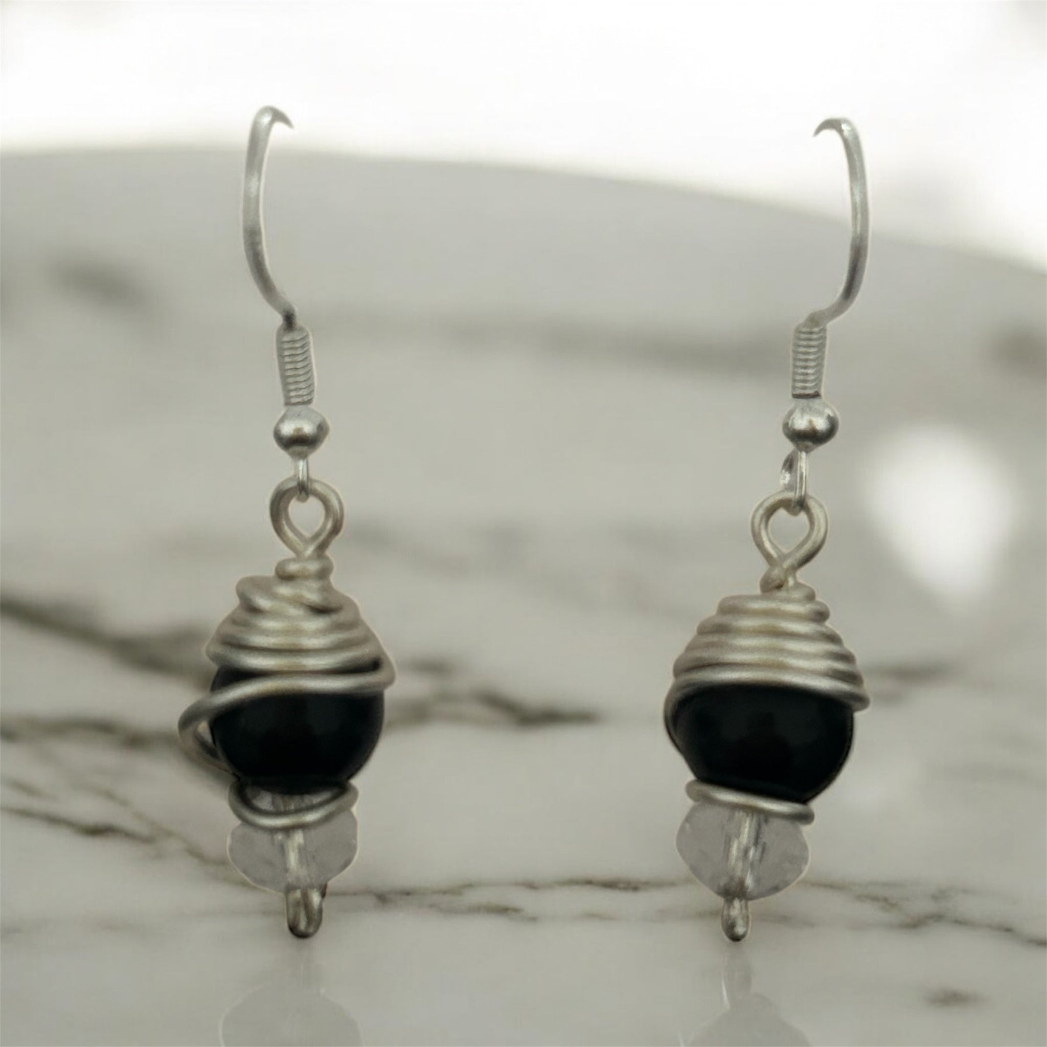 Handmade earrings with a black bead wrapped in silver plated wire, finished with a clear crystal bead and 925 Silver Plated hooks. Lightweight, modern, and easy to wear with any outfit.