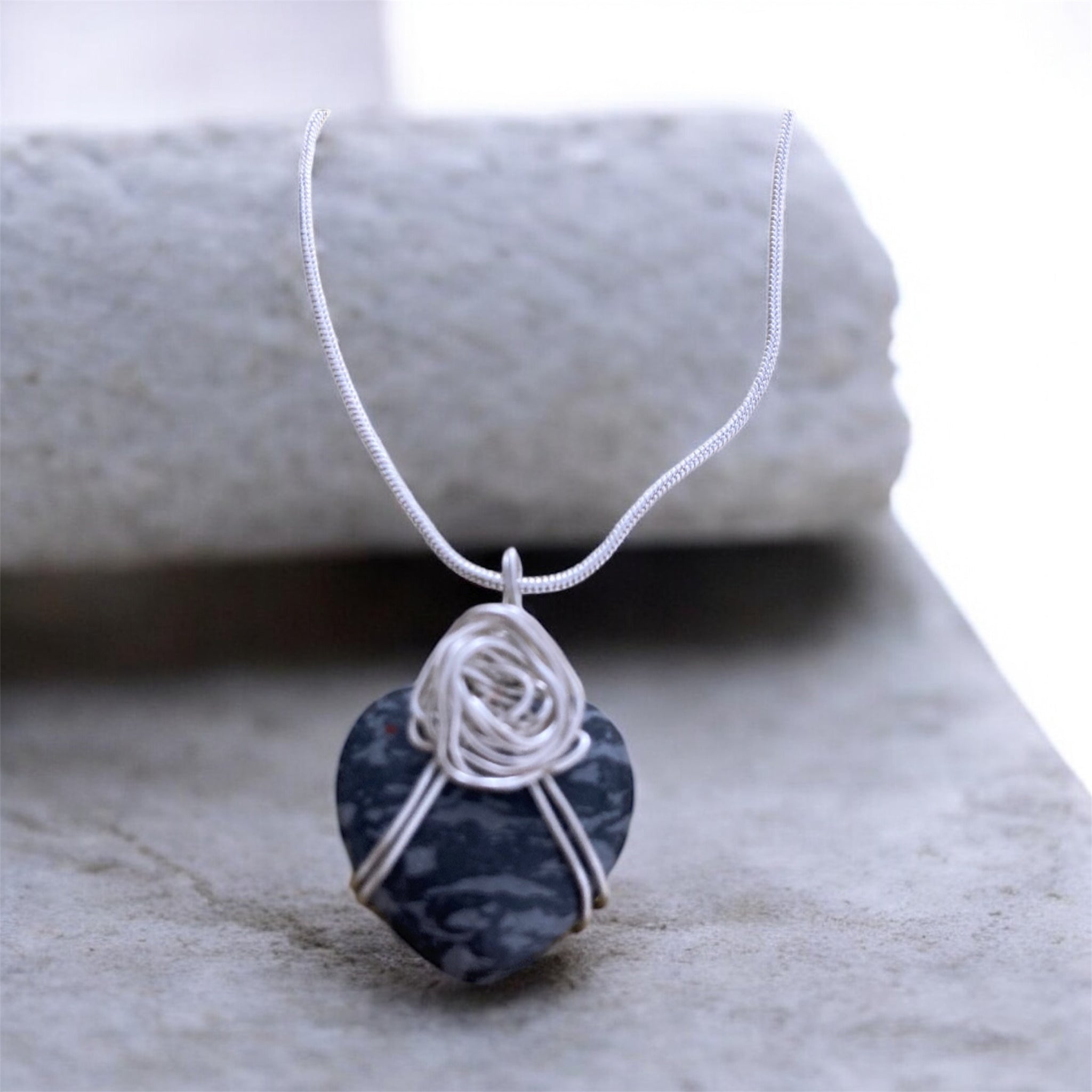 Beautiful marble effect heart pendant handcrafted with non tarnish silver wire. It comes with 925 Silver Sterling necklace.