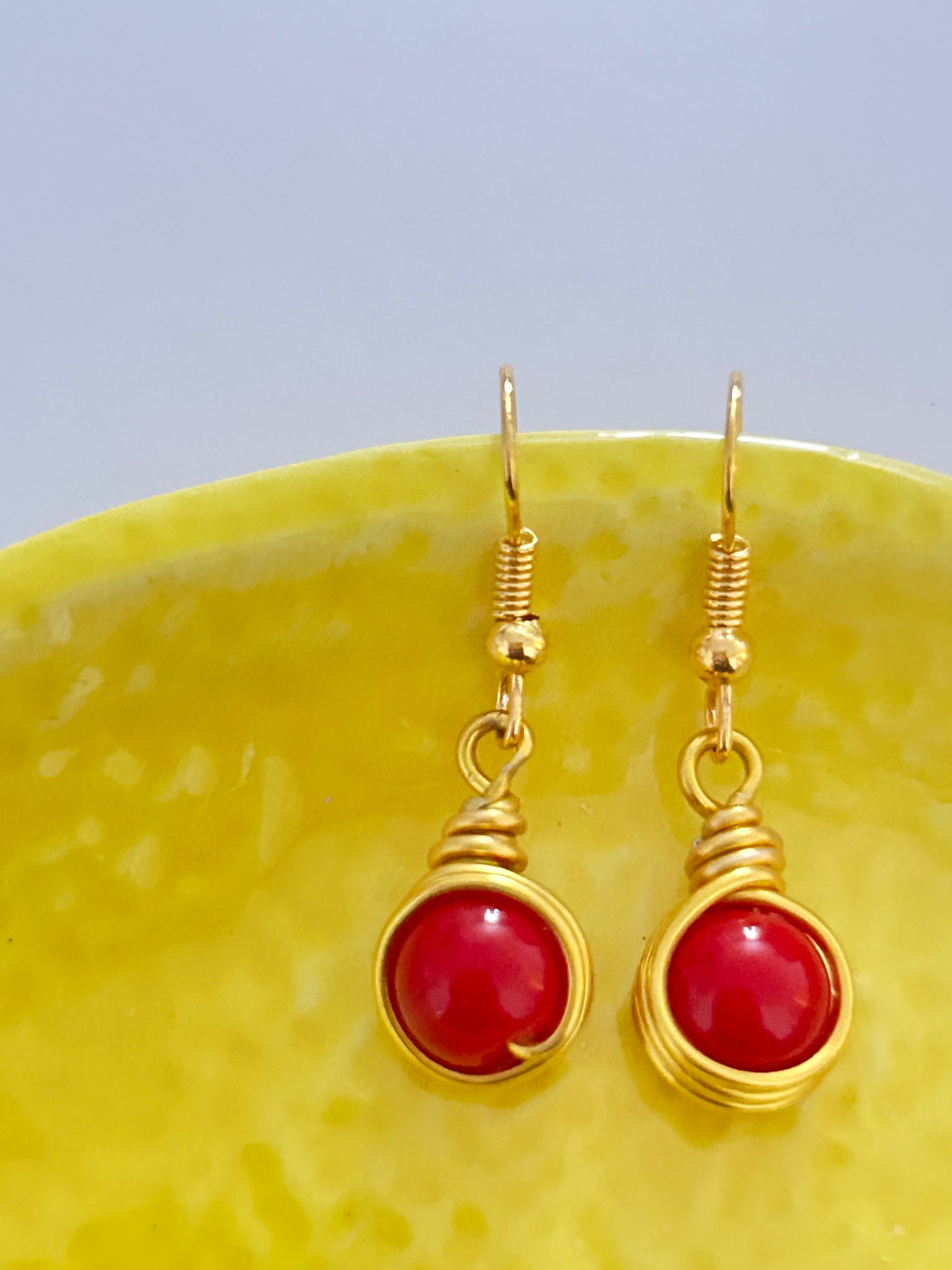 One of a kind earrings made with gold plated wire and red round beads.
