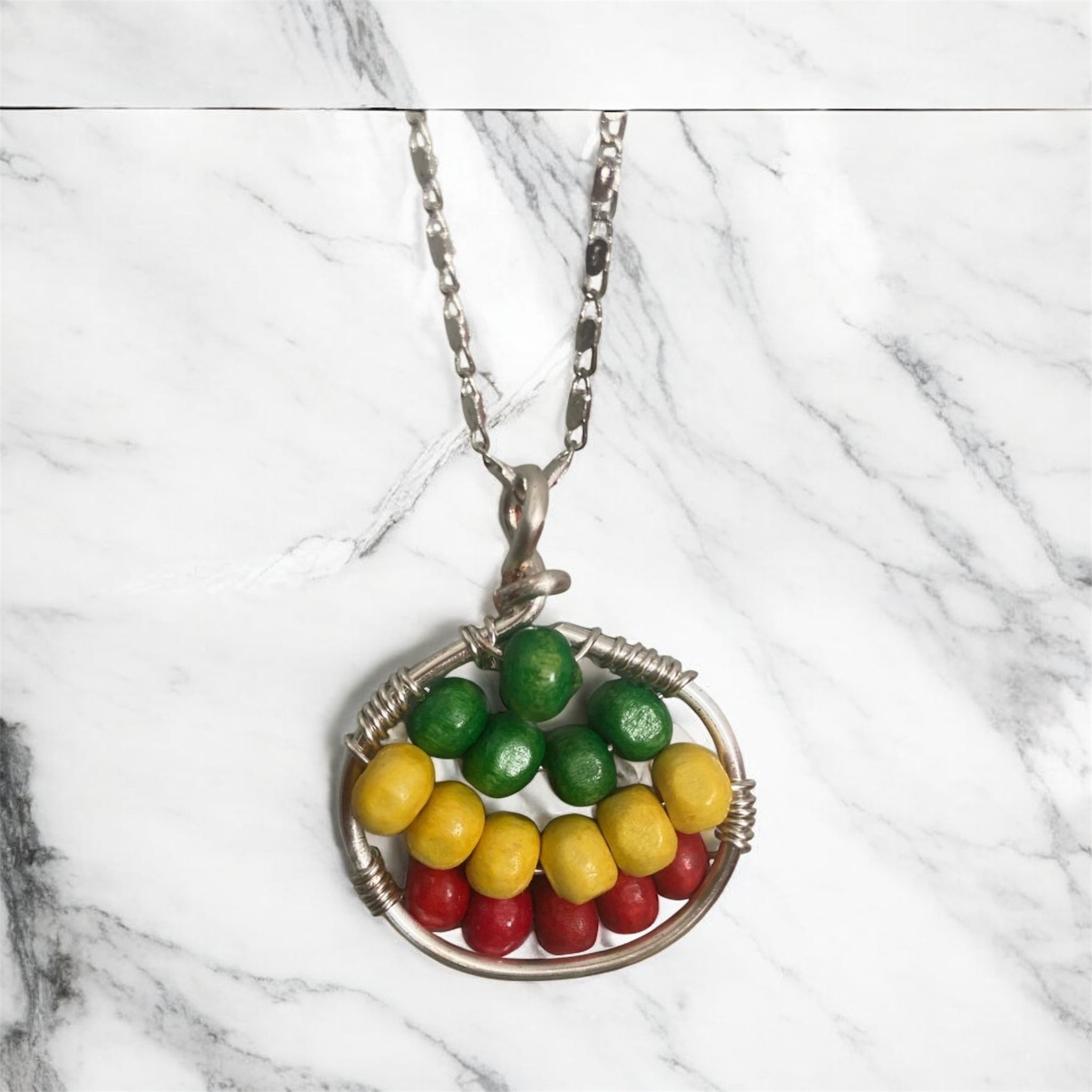 Round pendant handmade with wooden beads and silver wire. Available to be sold as a set with matching earrings and ring.
