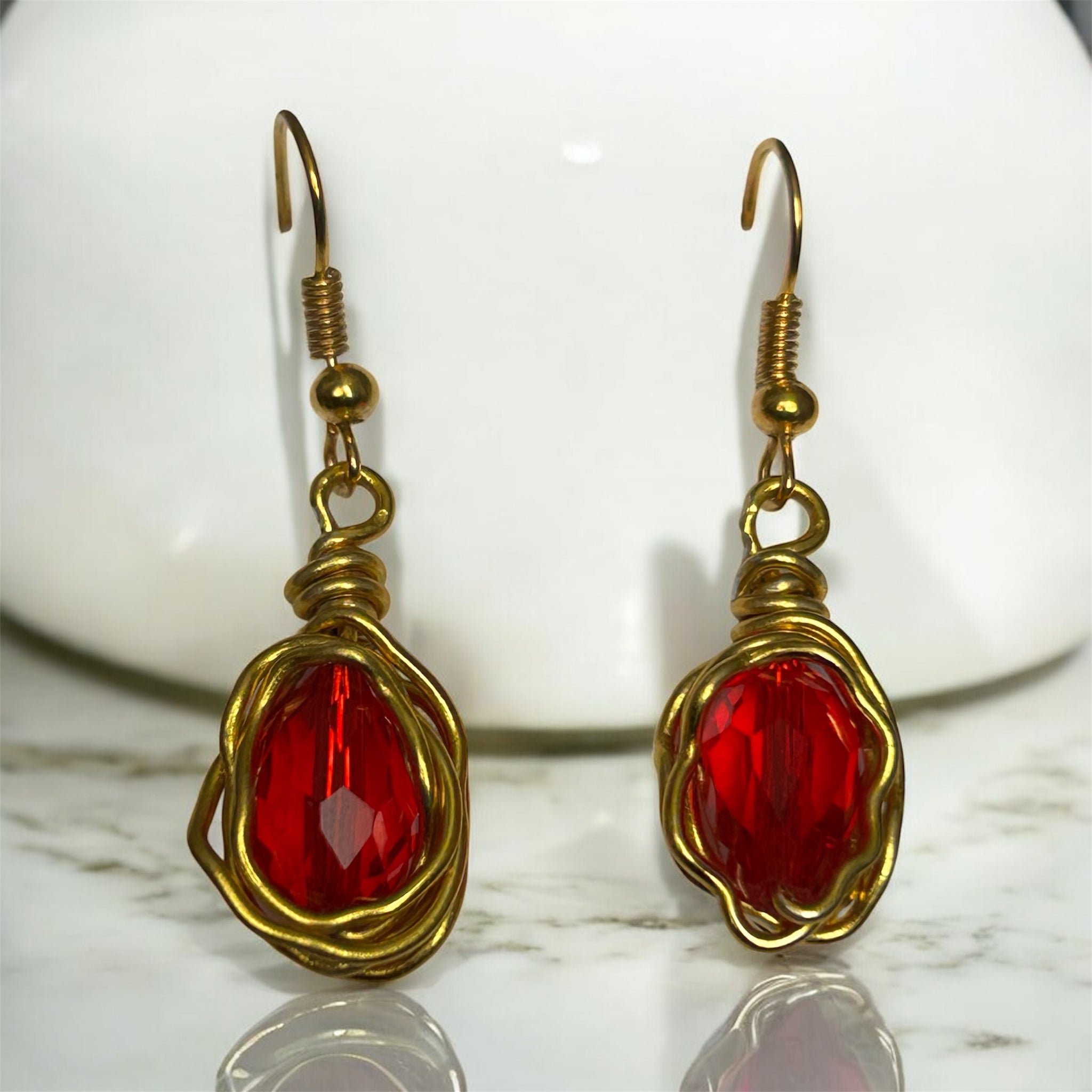 One of a kind earrings handmade with gold plated wire and red crystal drop beads.